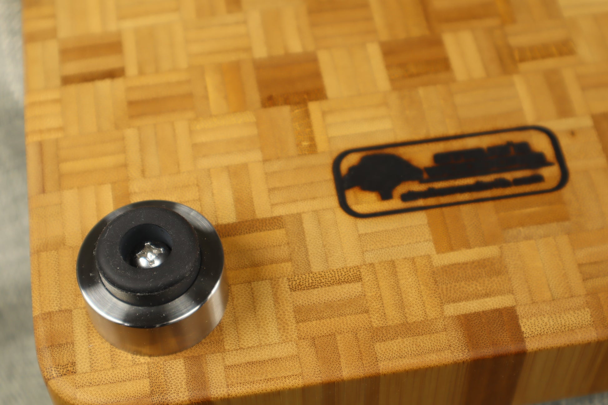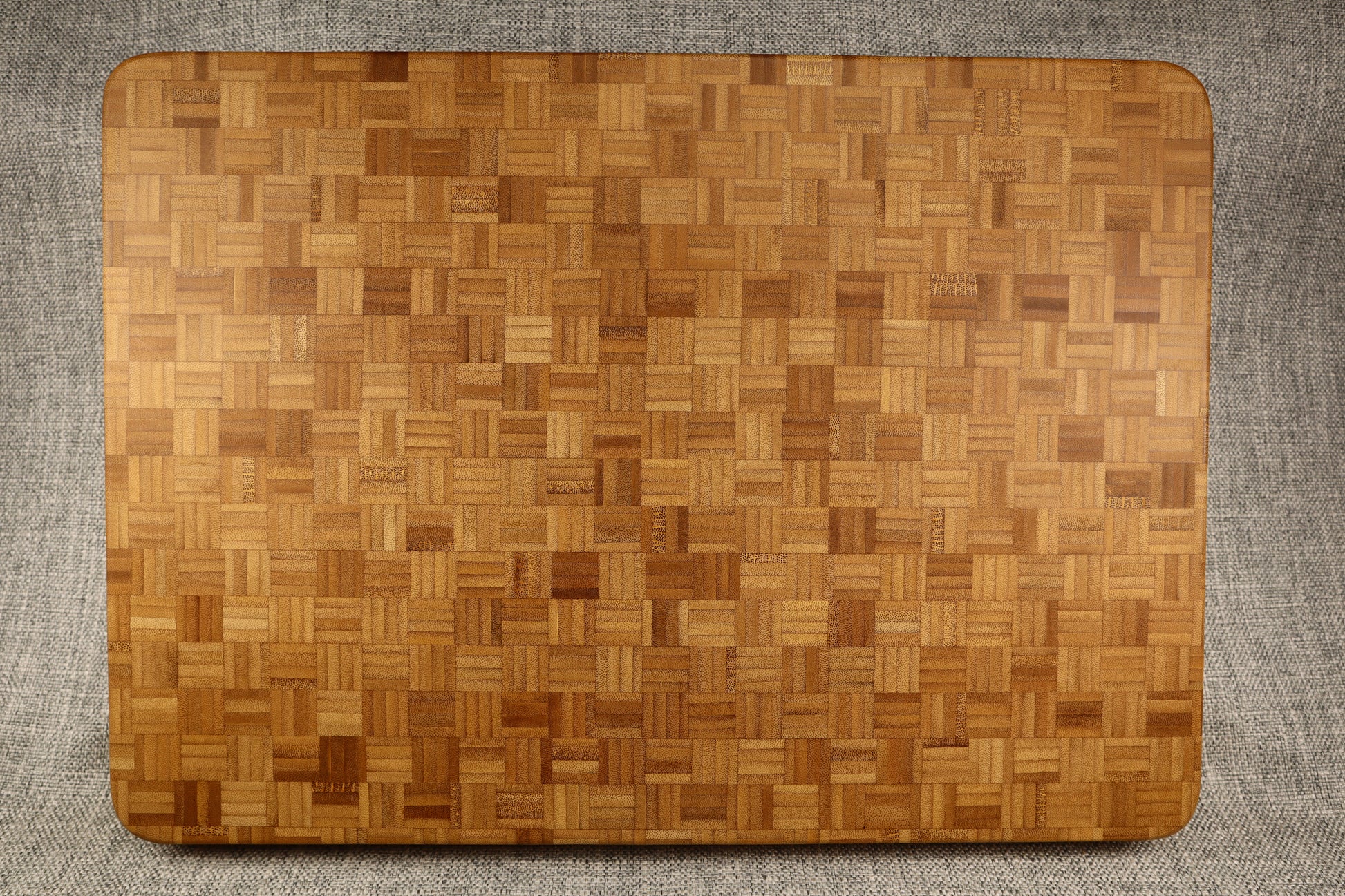 This 13x18x1-1/2" parquet end-grained Moso Bamboo cutting board has stainless steel legs and silicone non-marring, skid resistant feet. Exceptional quality that is unmatched in the industry while being visually appealing yet durable, knife friendly, and naturally anti-microbial. These smooth clean lines make this easy to clean, no handles, no grooves, but elevated by the legs to allow you to pick up and move, while the silicone feet give grip to your countertop or working table. It's a 'must-have' for every kitchen. This sized board has between 5-6000 fine pieces of bamboo end-grained strips, making the structural integrity much better than any competitor's. Moso bamboo is 20-25% harder than the standard 'hard-rock maple' used in other high-end cutting boards. These are handcrafted and made in the USA!